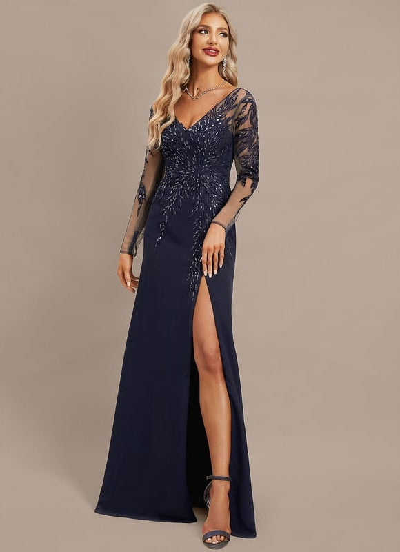 Cette robe sirène manche longue est une véritable déclaration de style. Sa forme "fourreau" (la partie ajustée) puis "sirène" (l'évasement) sublime la silhouette, tandis que les paillettes, méticuleusement appliquées sur le buste et les manches, créent un motif éclatant qui attire la lumière à chaque mouvement. Le col V élégant est complété par un dos en V tout aussi raffiné, offrant une harmonie parfaite. Les manches longues en mousseline sont légères et aériennes, ajoutant une dimension de sophistication sans alourdir la tenue. Et bien sûr, la fente sur la jambe n'est pas seulement un détail de mode ; elle offre une liberté de mouvement et une touche de sensualité qui rend cette robe inoubliable. Avec un soutien-gorge intégré, elle assure un maintien parfait et une silhouette impeccable, vous permettant de vous sentir à l'aise et magnifique tout au long de l'événement.